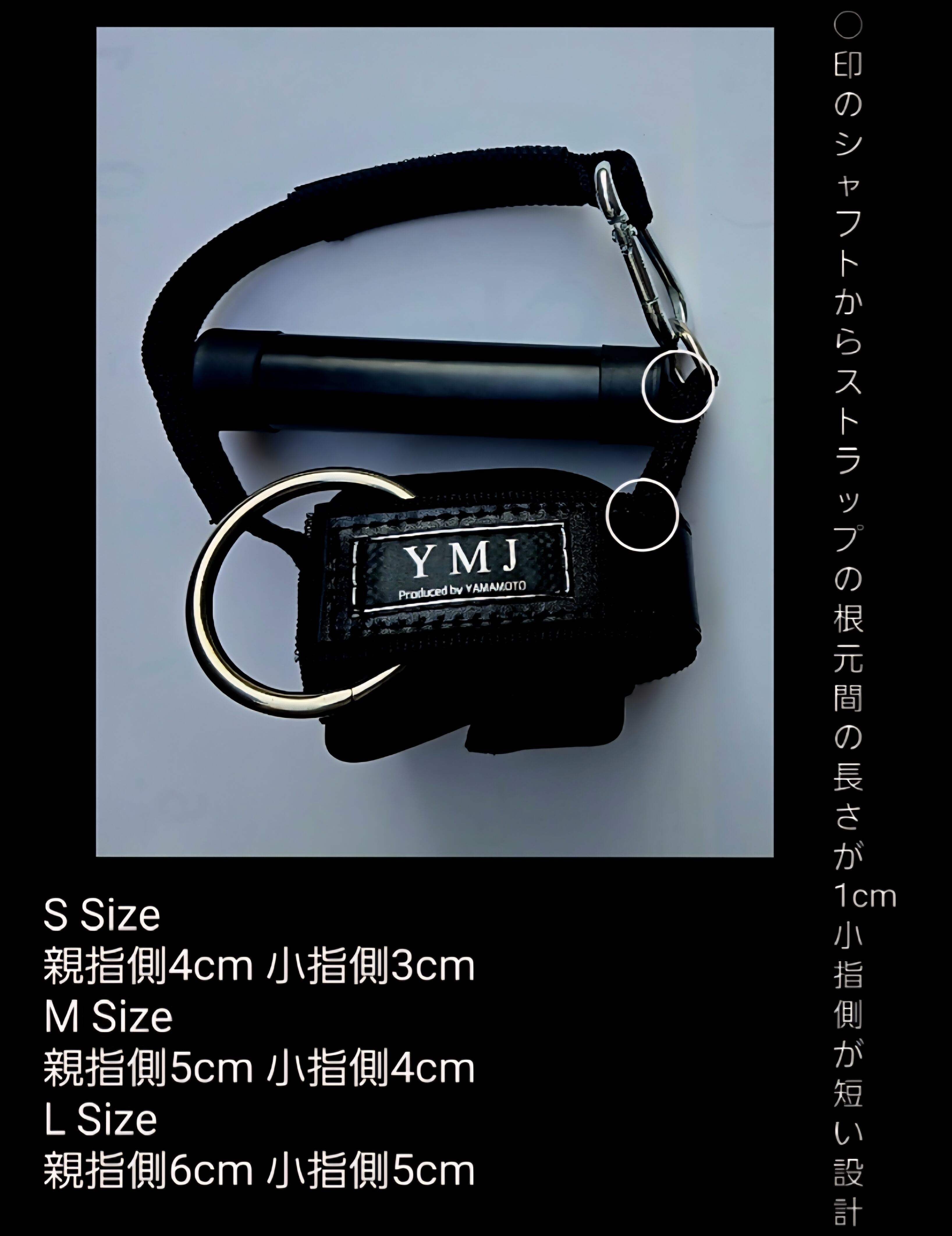 ギアを装置した際は、かなり手のひらに食い込むレベルのサイズ感になっており、特に背中のトレーニング使用時に輪型ストラップが引っ張られる際に、手のひらからグリップが離れない様に設計しておりますので予めご了承下さい。